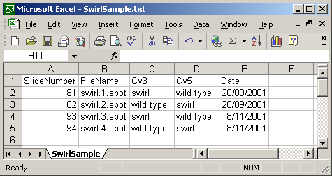 The ImaGene Targets file below shows the special case of the ImaGene image-processing software which gives two (tab-delimited text) output files for each slide, one for the Cy3 (Green) channel and one for the Cy5 (Red) channel. So instead of having a single FileName column, there are two file name columns: a FileNameCy3 column and a FileNameCy5 column.
