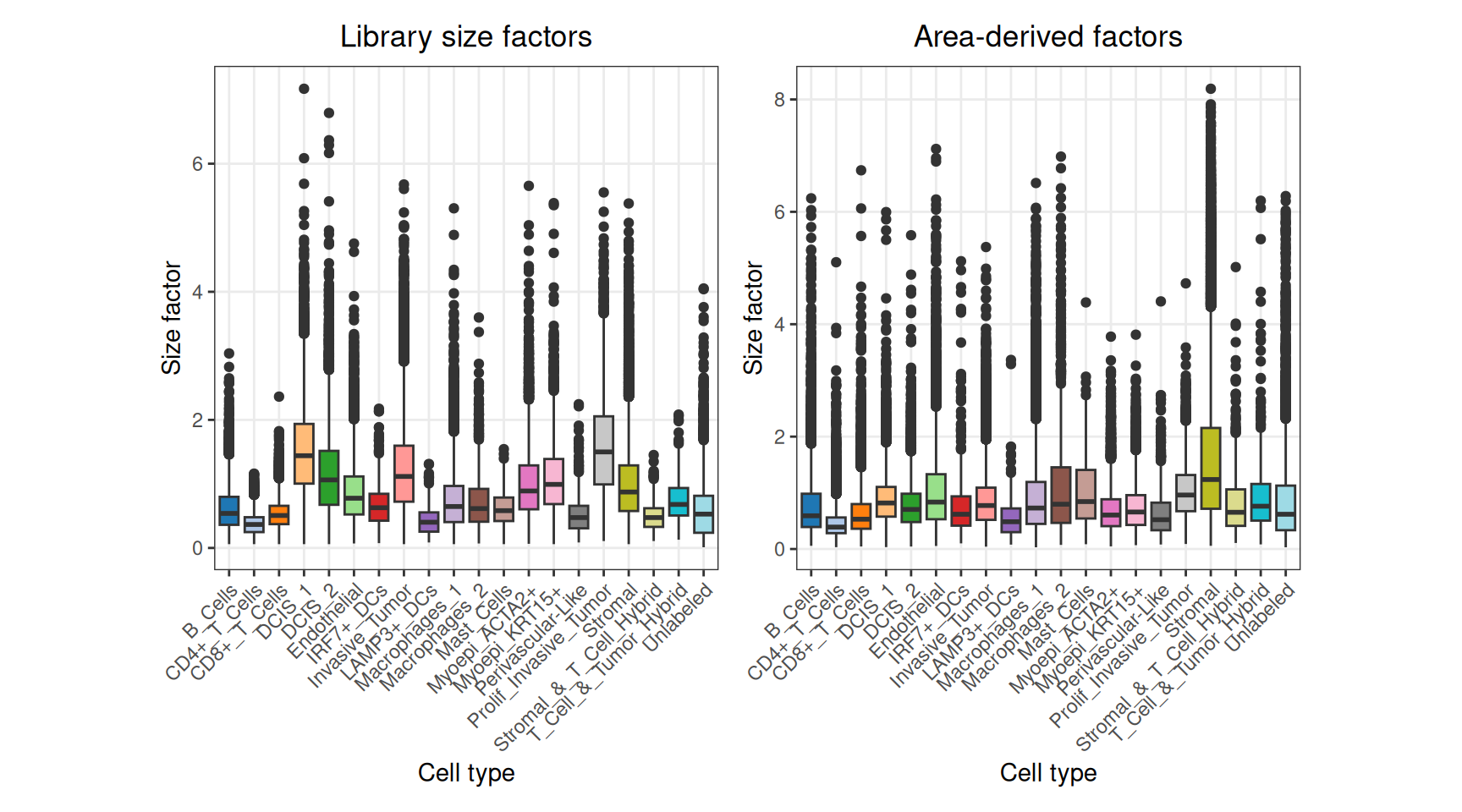 We can clearly see that library size factors of tumor cells are systematically higher than those of other cell types, which is a sign of confounding between library size and biology.