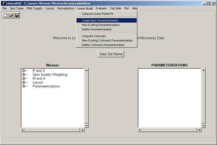 Open the file, WeaverArraysLoaded.lma. This file can be downloaded from the URL given above. Advanced users may be interested to know that a Limma (.lma) file is really just an RData file, so it can easily be loaded into an R session. However, it may appear more complicated than standard RData files associated with the limma package because it allows for multiple parameterizations and stores them in a list data structure.