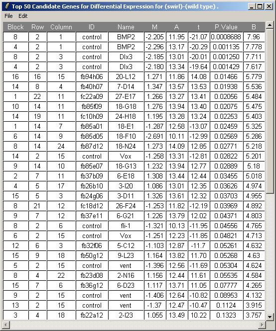 The toptable is shown below. Note that the BMP2 gene is correctly ranked at the top of the list and is down-regulated (i.e. it has a negative M value) because Swirl fish are mutant in this gene. Other positive controls appear in the top 50 genes. You can save this toptable (as tab-delimited text) or copy it to the clipboard. (If you chose to show all genes, the table will be too large to display and the spreadsheet/table window, so it will be shown in a text window instead, but it will still look exactly the same after you save it as tab-delimited text and view it in an external spreadsheet program.)