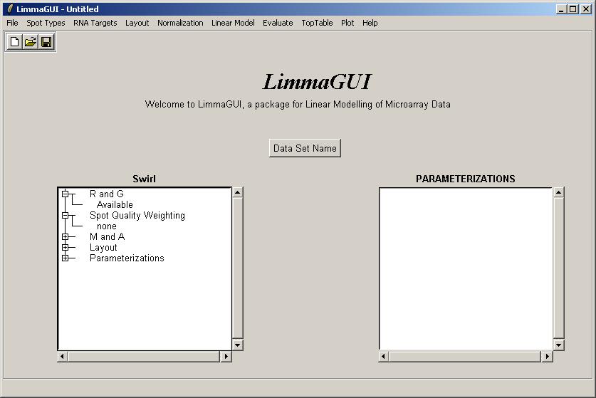 Once the data set has been loaded, its name is displayed on top of the left status window. The status window shows that Red and Green background-corrected intensities (R and G) have been loaded, and that there is no spot-quality weighting. The data set name can be later modified with the "Data Set Name" button. The data set name is not the same as the file name, displayed in the title bar. For example, the same data set (Swirl) could be saved at two different stages of the analysis, e.g. SwirlArraysLoaded.lma and SwirlLinearModelComputed.lma.