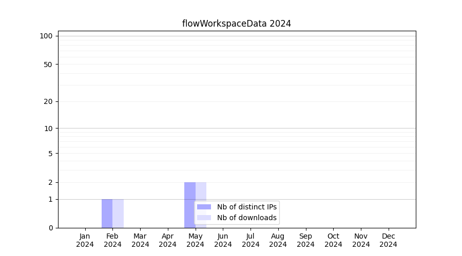 Number of downloads for software package flowWorkspaceData, year by year, from 2025 back to 2014 (years with no downloads are omitted):