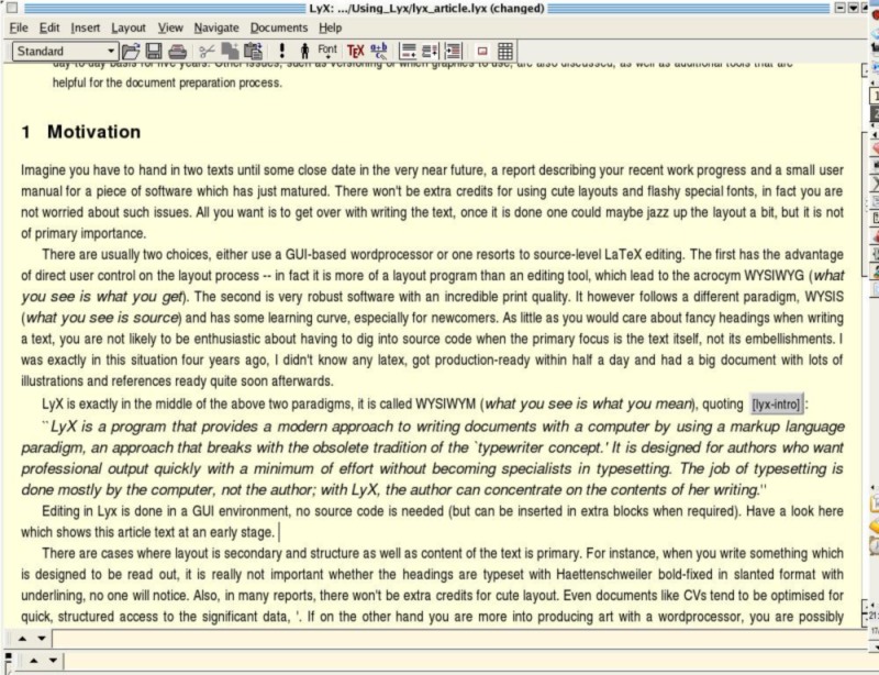 Il est certain que si vous ne devez rédiger que votre liste des courses ou un mémo de deux paragraphe, utiliser Lyx est excessif. Mais si vous cherchez à rédiger des textes de plus de 500 mots avec une certaine structure et des références croisées, vous pouvez vous attendre à découvrir de grandes perspectives avec Lyx.
