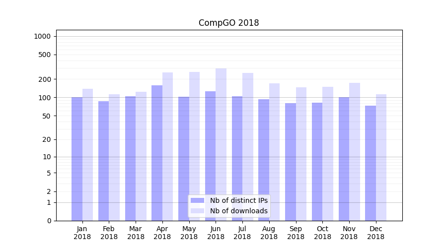 Number of downloads for software package CompGO, year by year, from 2025 back to 2014 (years with no downloads are omitted):