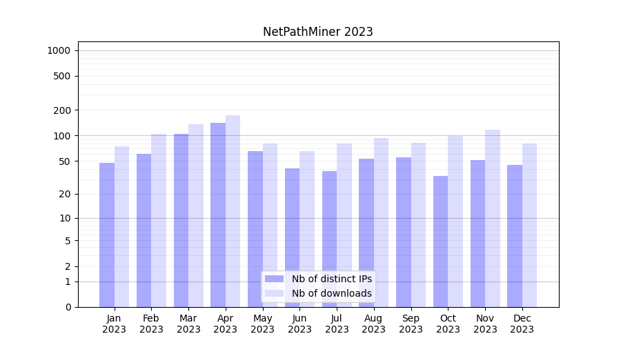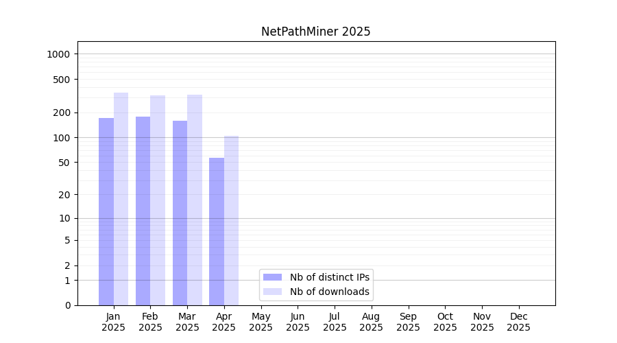 Number of downloads for software package NetPathMiner, year by year, from 2025 back to 2014 (years with no downloads are omitted):