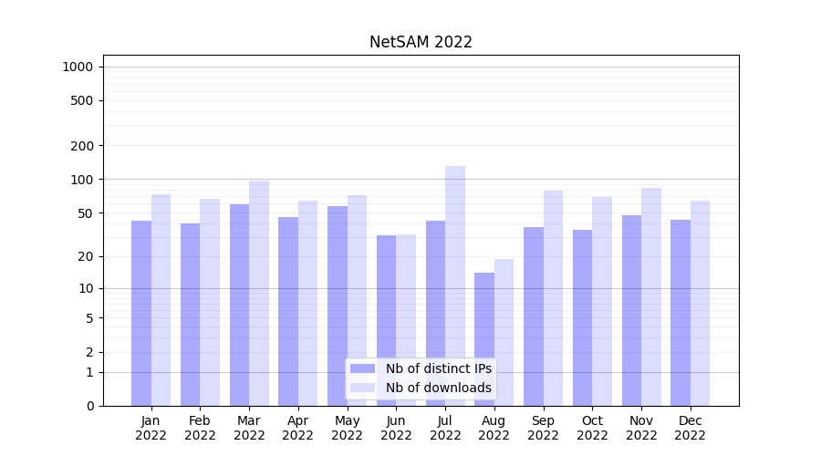 Number of downloads for software package NetSAM, year by year, from 2025 back to 2014 (years with no downloads are omitted):