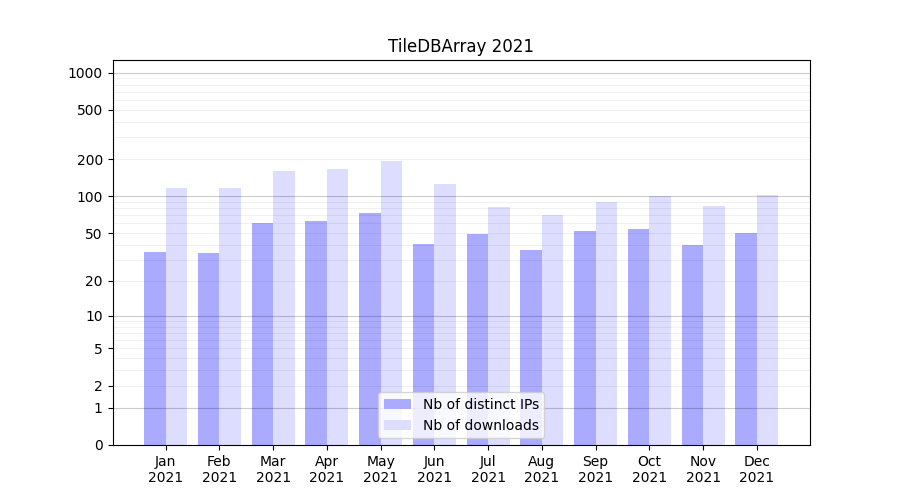 Number of downloads for software package TileDBArray, year by year, from 2025 back to 2014 (years with no downloads are omitted):