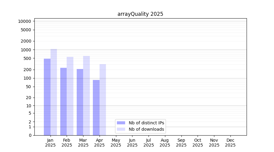 Number of downloads for software package arrayQuality, year by year, from 2025 back to 2014 (years with no downloads are omitted):