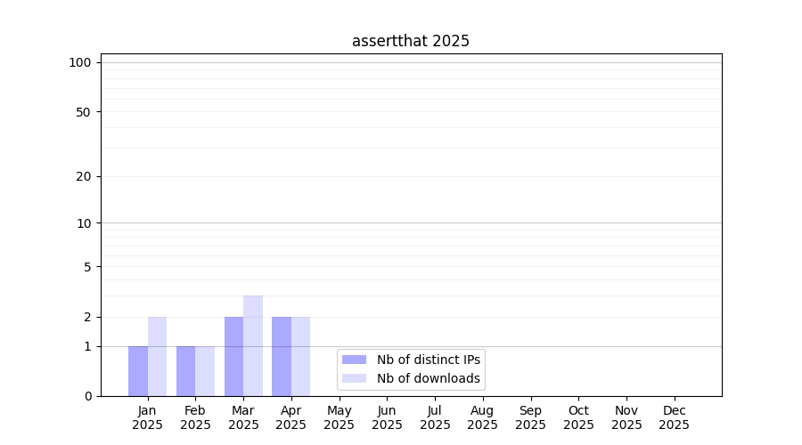 Number of downloads for software package assertthat, year by year, from 2025 back to 2014 (years with no downloads are omitted):