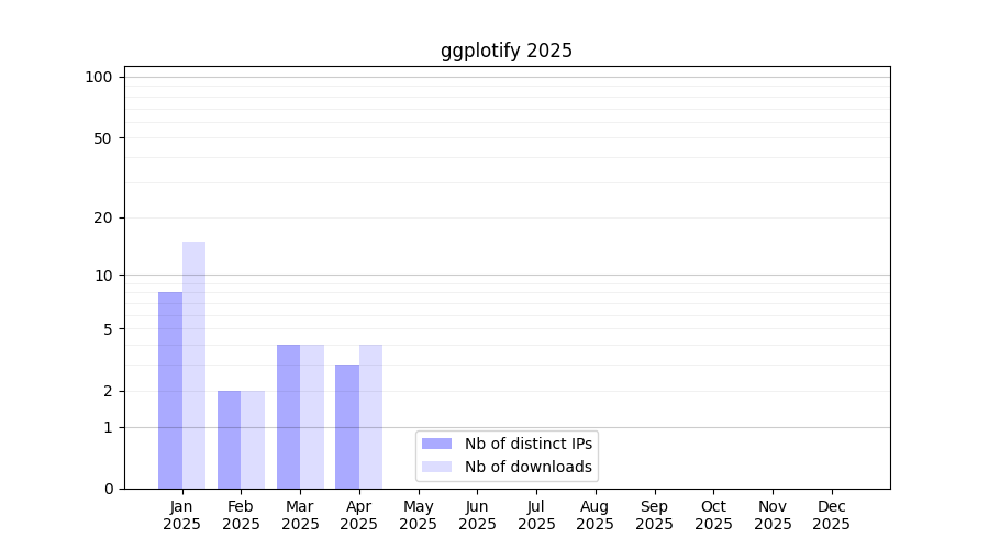 Number of downloads for software package ggplotify, year by year, from 2025 back to 2014 (years with no downloads are omitted):