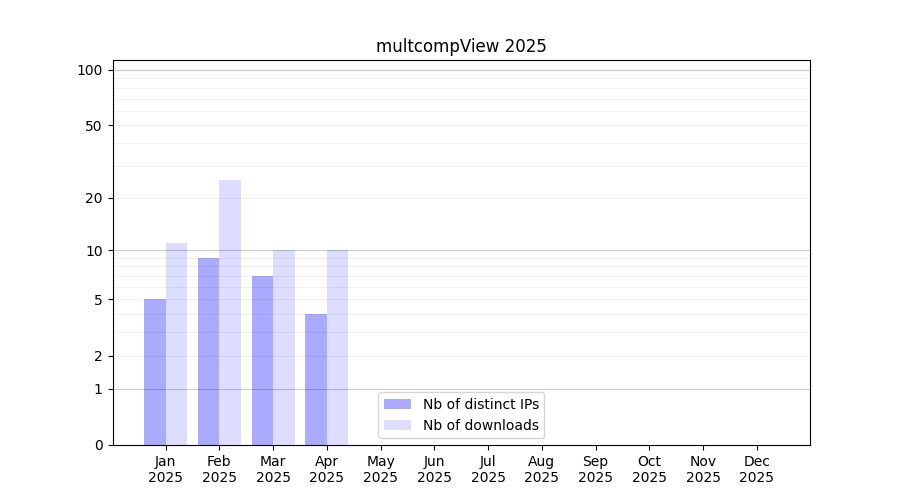 Number of downloads for software package multcompView, year by year, from 2025 back to 2014 (years with no downloads are omitted):