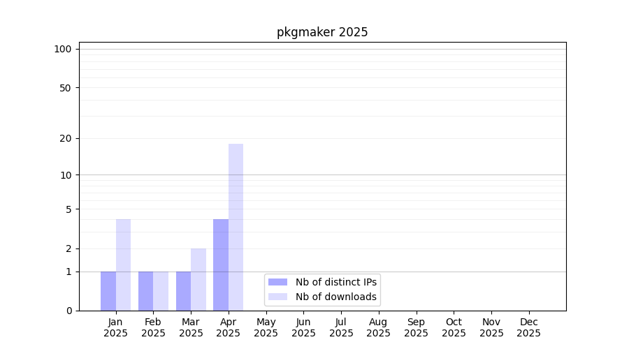 Number of downloads for software package pkgmaker, year by year, from 2025 back to 2014 (years with no downloads are omitted):
