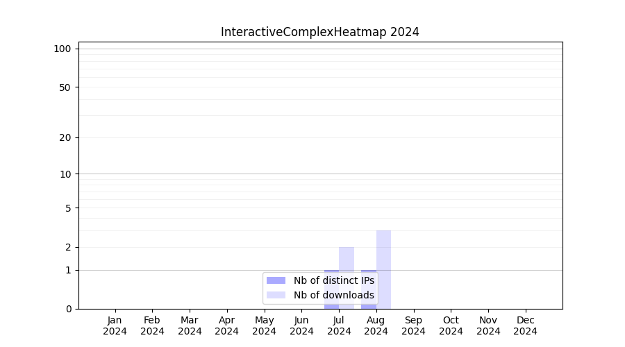 Number of downloads for annotation package InteractiveComplexHeatmap, year by year, from 2025 back to 2014 (years with no downloads are omitted):