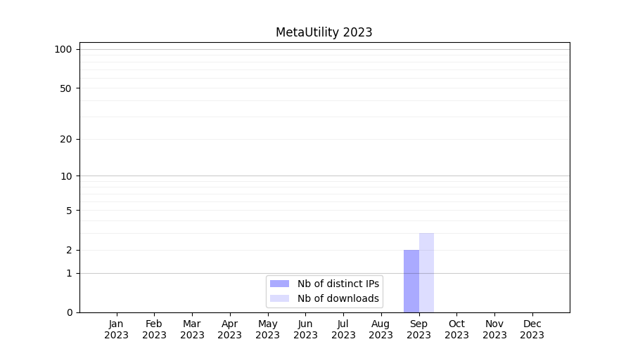 Number of downloads for annotation package MetaUtility, year by year, from 2025 back to 2014 (years with no downloads are omitted):