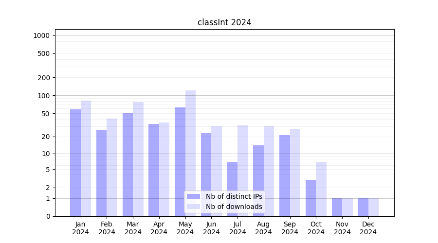 Number of downloads for annotation package classInt, year by year, from 2025 back to 2014 (years with no downloads are omitted):