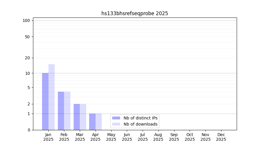 Number of downloads for annotation package hs133bhsrefseqprobe, year by year, from 2025 back to 2014 (years with no downloads are omitted):