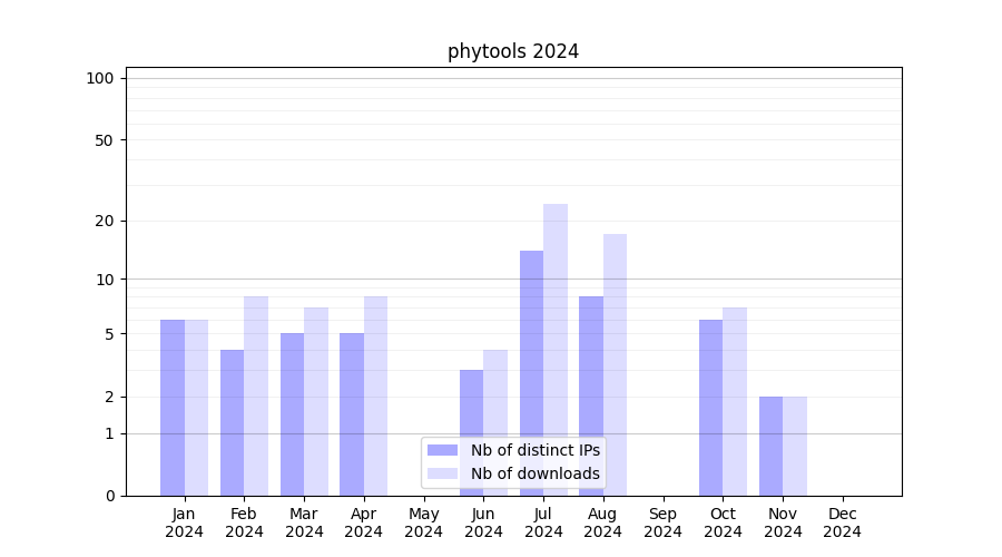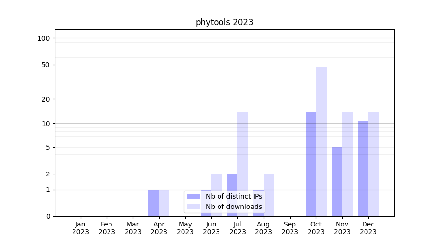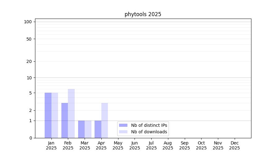 Number of downloads for annotation package phytools, year by year, from 2025 back to 2014 (years with no downloads are omitted):