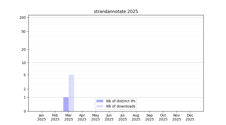 Number of downloads for annotation package strandannotate, year by year, from 2025 back to 2014 (years with no downloads are omitted):
