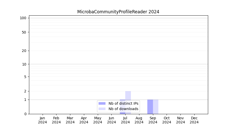 Number of downloads for experiment package MicrobaCommunityProfileReader, year by year, from 2025 back to 2014 (years with no downloads are omitted):