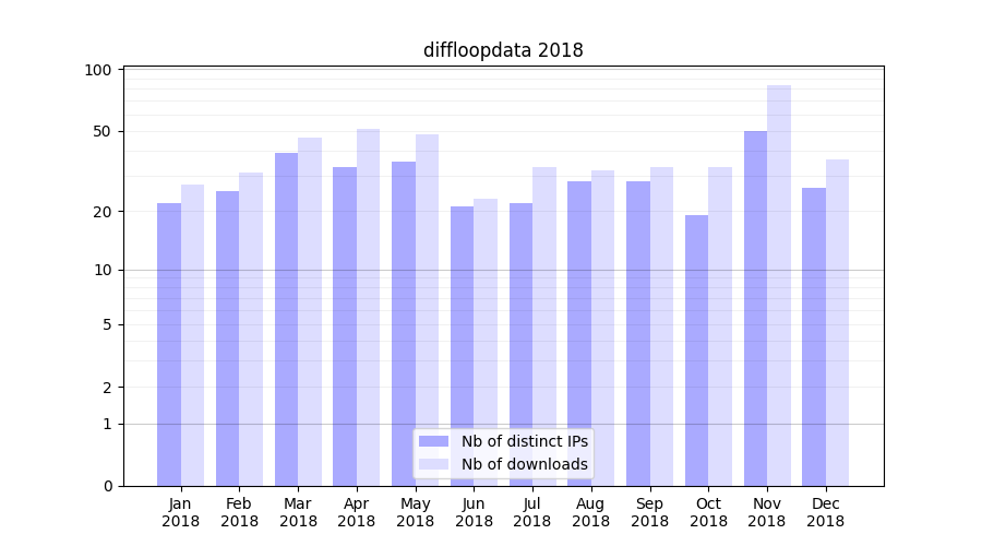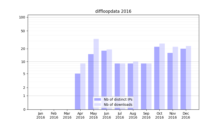 Number of downloads for experiment package diffloopdata, year by year, from 2025 back to 2014 (years with no downloads are omitted):