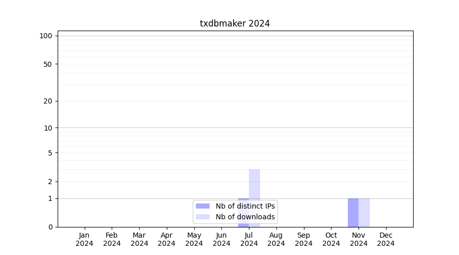 Number of downloads for experiment package txdbmaker, year by year, from 2025 back to 2014 (years with no downloads are omitted):