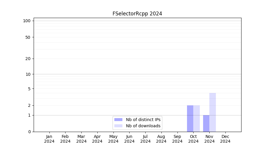 Number of downloads for workflow package FSelectorRcpp, year by year, from 2025 back to 2015 (years with no downloads are omitted):