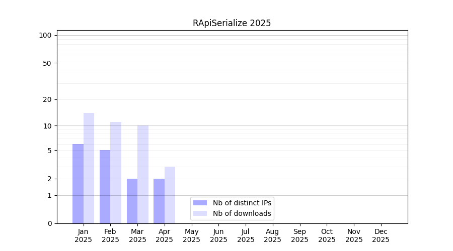 Number of downloads for workflow package RApiSerialize, year by year, from 2025 back to 2015 (years with no downloads are omitted):