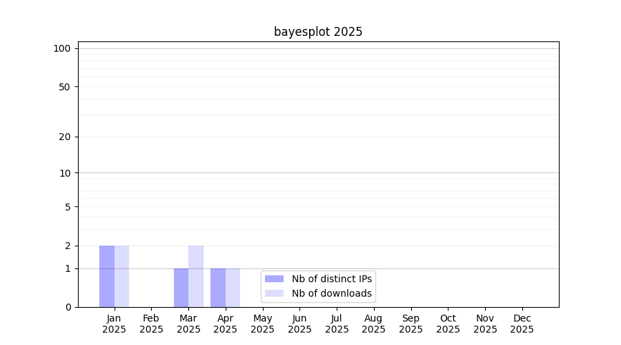 Number of downloads for workflow package bayesplot, year by year, from 2025 back to 2015 (years with no downloads are omitted):