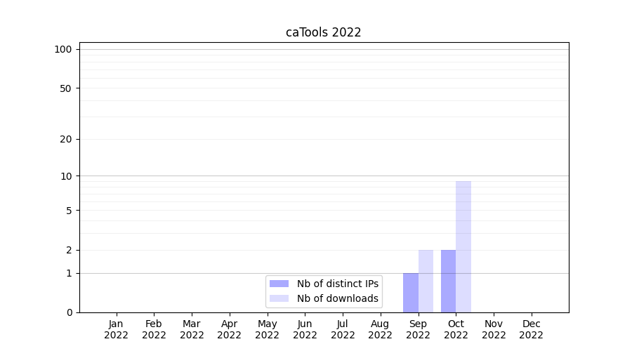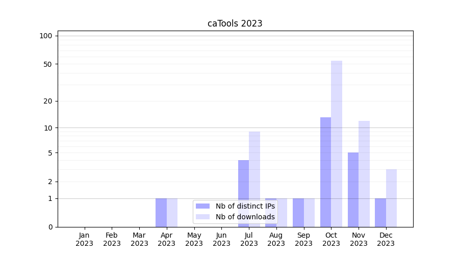 Number of downloads for workflow package caTools, year by year, from 2025 back to 2015 (years with no downloads are omitted):