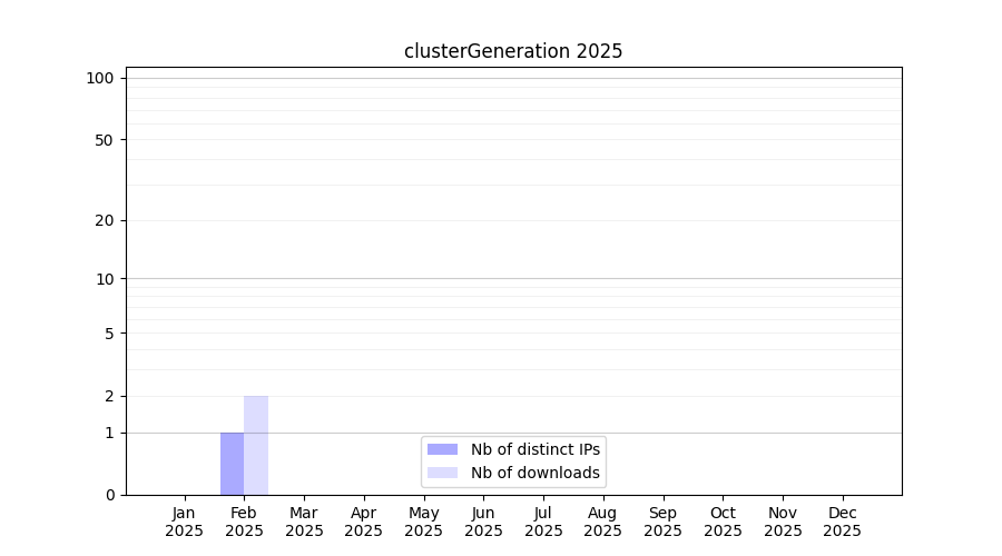 Number of downloads for workflow package clusterGeneration, year by year, from 2025 back to 2015 (years with no downloads are omitted):