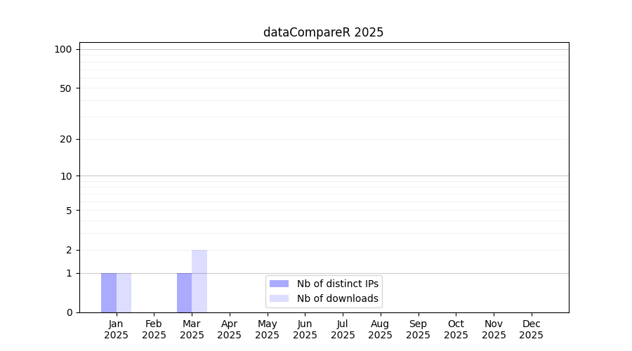 Number of downloads for workflow package dataCompareR, year by year, from 2025 back to 2015 (years with no downloads are omitted):