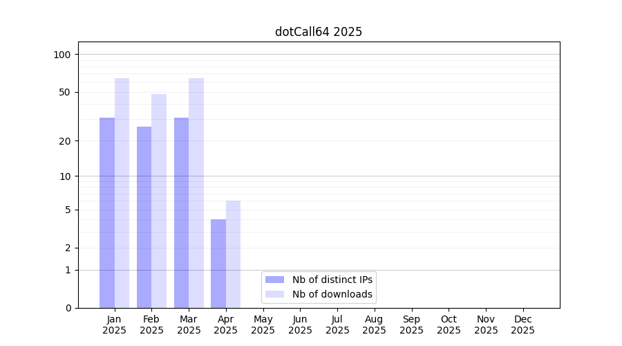 Number of downloads for workflow package dotCall64, year by year, from 2025 back to 2015 (years with no downloads are omitted):
