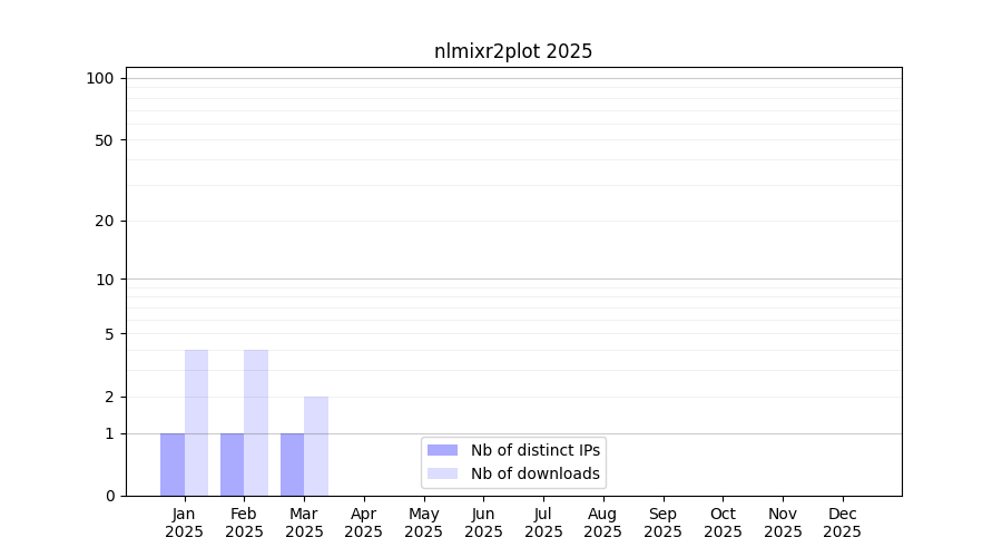 Number of downloads for workflow package nlmixr2plot, year by year, from 2025 back to 2015 (years with no downloads are omitted):