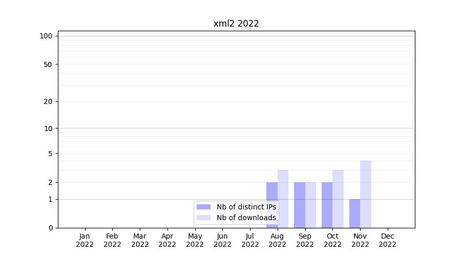 Number of downloads for workflow package xml2, year by year, from 2025 back to 2015 (years with no downloads are omitted):