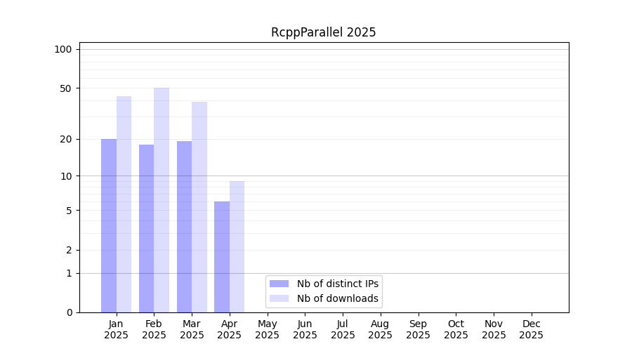 Number of downloads for annotation package RcppParallel, year by year, from 2025 back to 2014 (years with no downloads are omitted):