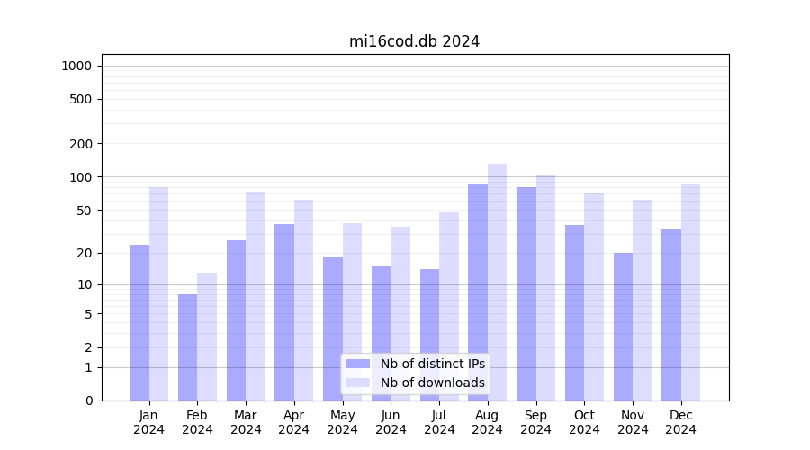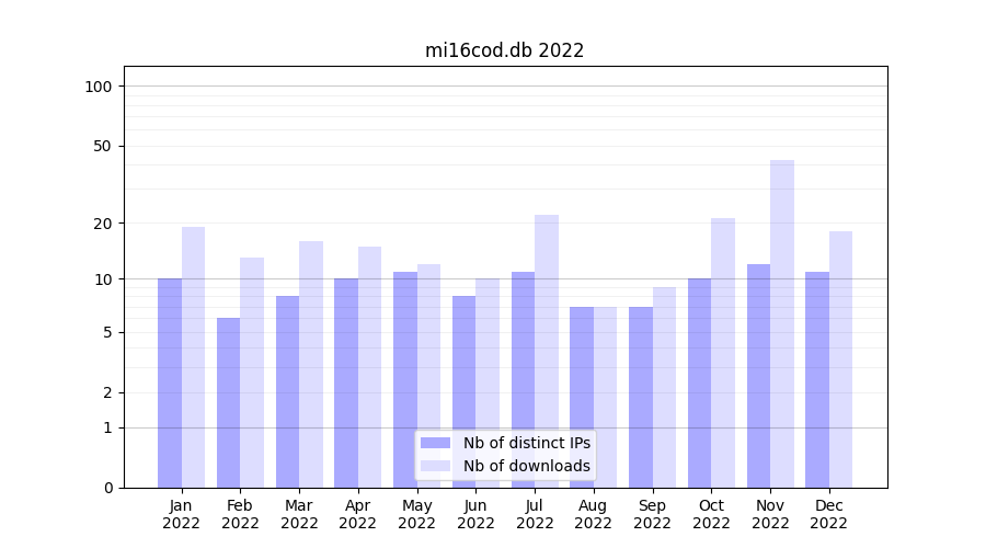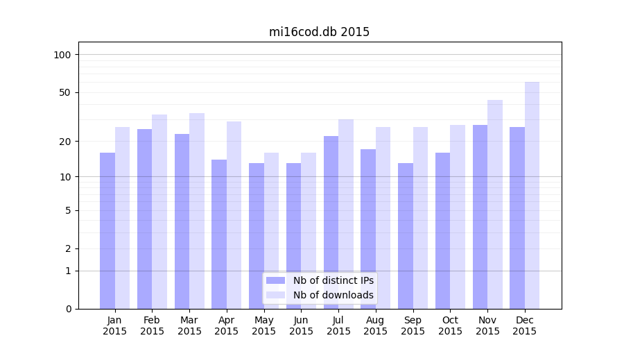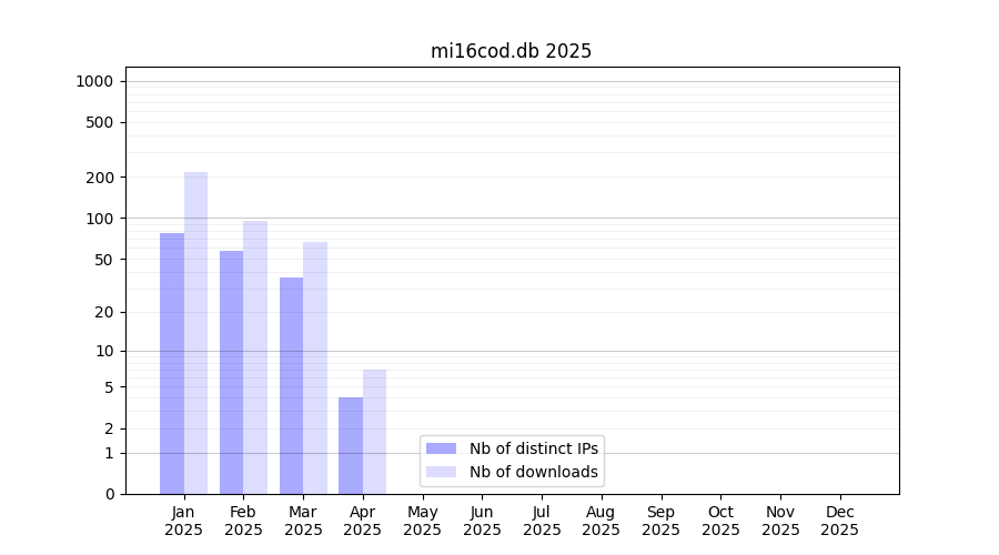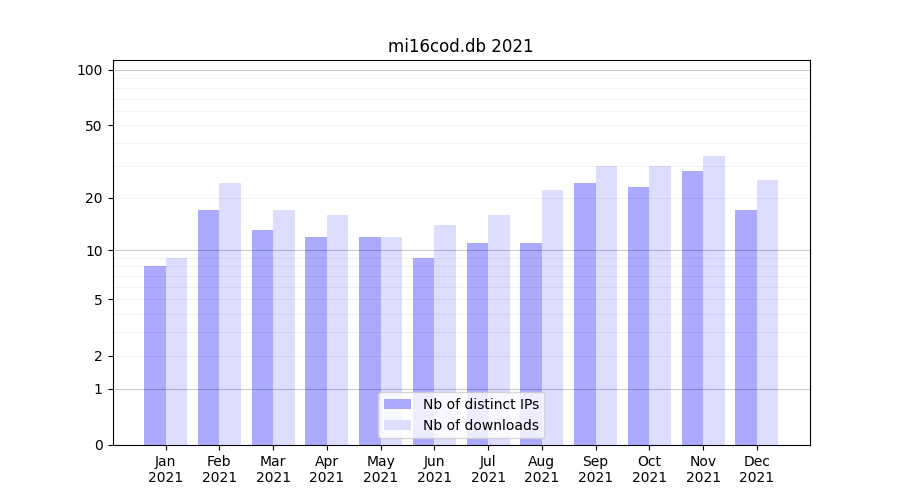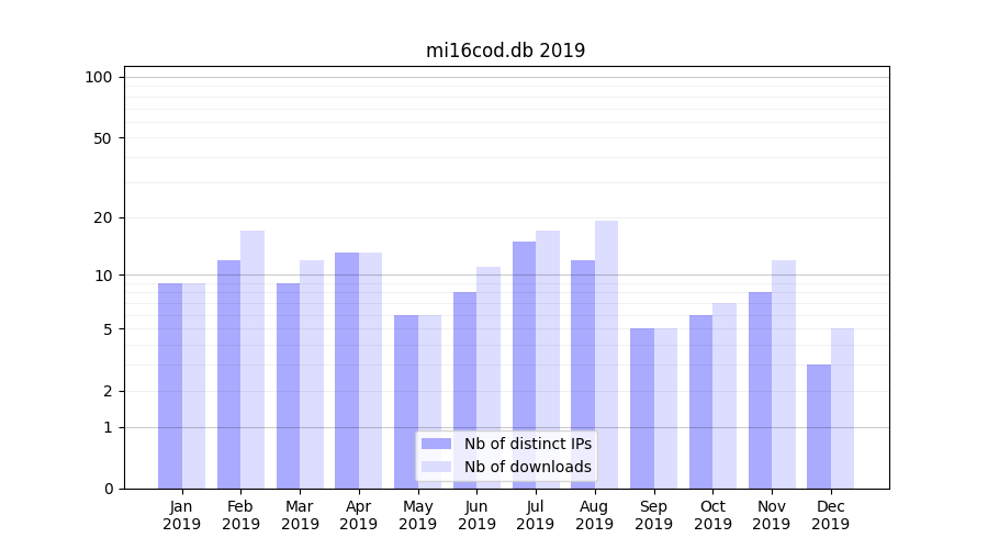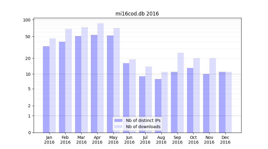 Number of downloads for annotation package mi16cod.db, year by year, from 2025 back to 2014 (years with no downloads are omitted):