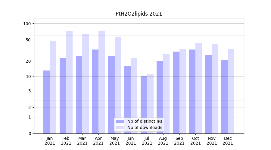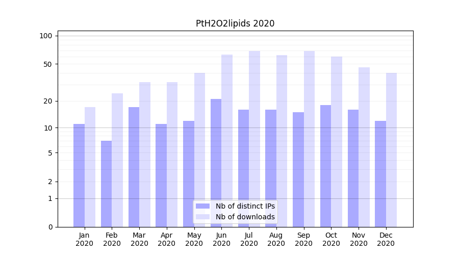 Number of downloads for experiment package PtH2O2lipids, year by year, from 2025 back to 2014 (years with no downloads are omitted):