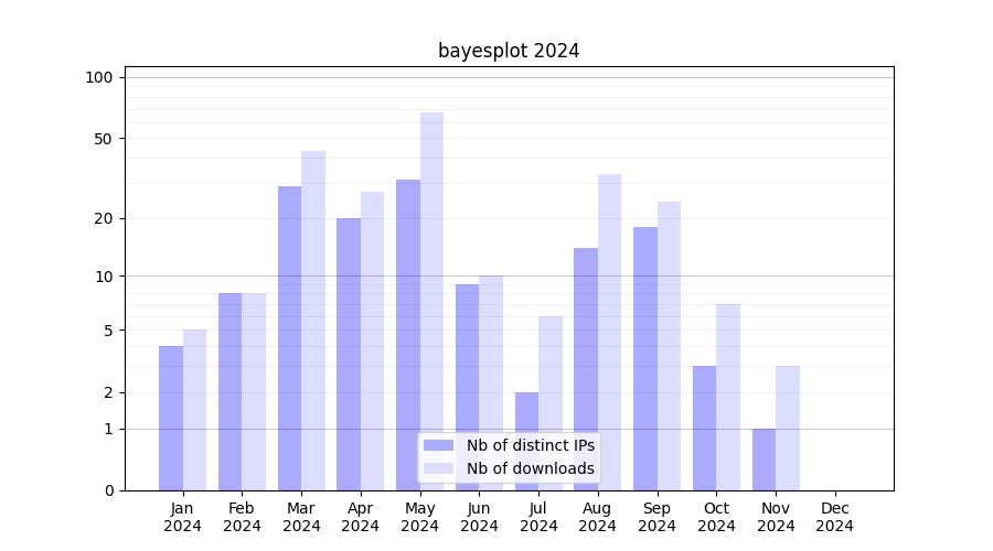 Number of downloads for experiment package bayesplot, year by year, from 2025 back to 2014 (years with no downloads are omitted):