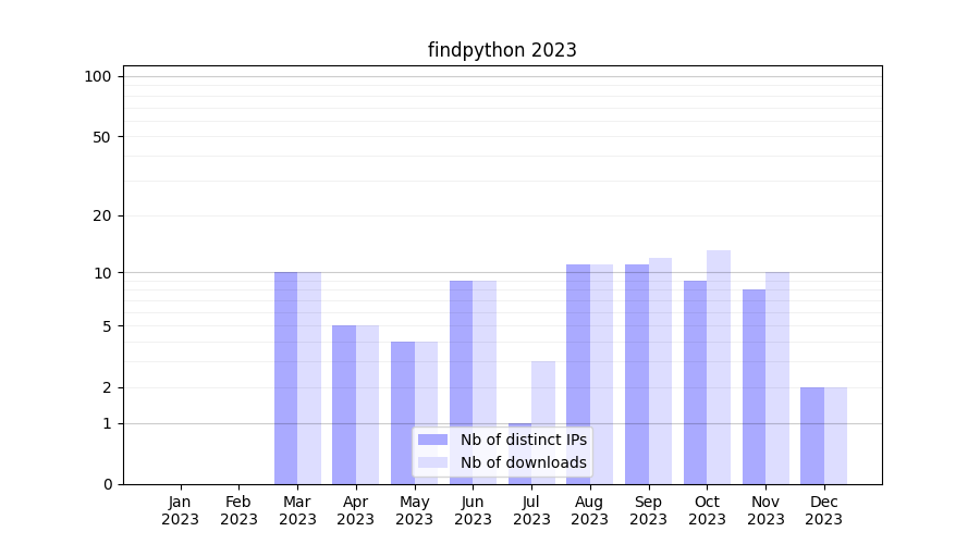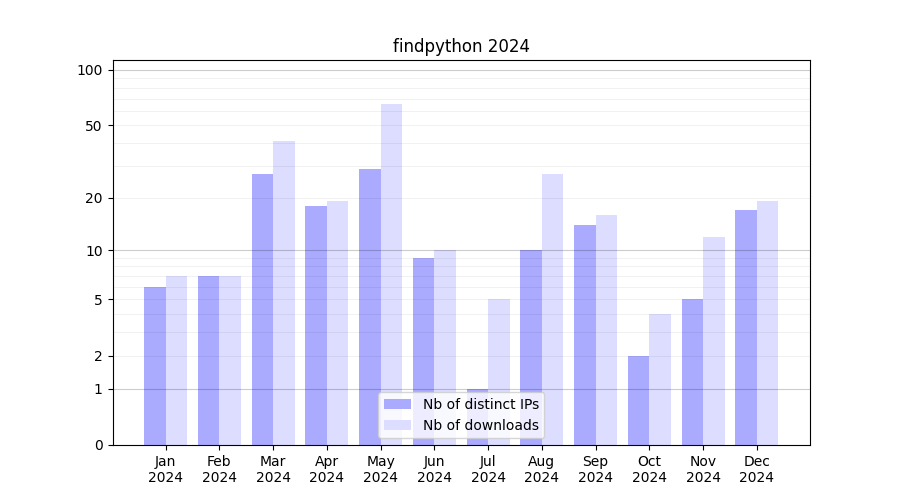 Number of downloads for experiment package findpython, year by year, from 2025 back to 2014 (years with no downloads are omitted):
