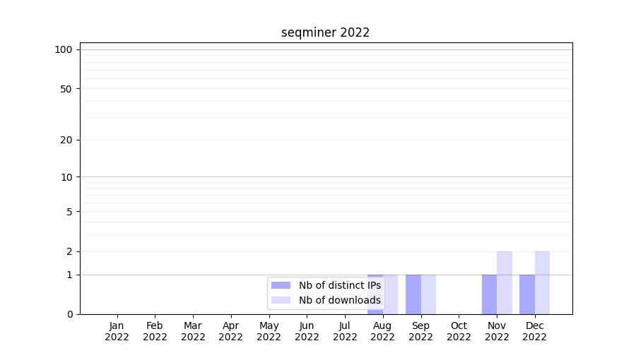 Number of downloads for experiment package seqminer, year by year, from 2025 back to 2014 (years with no downloads are omitted):