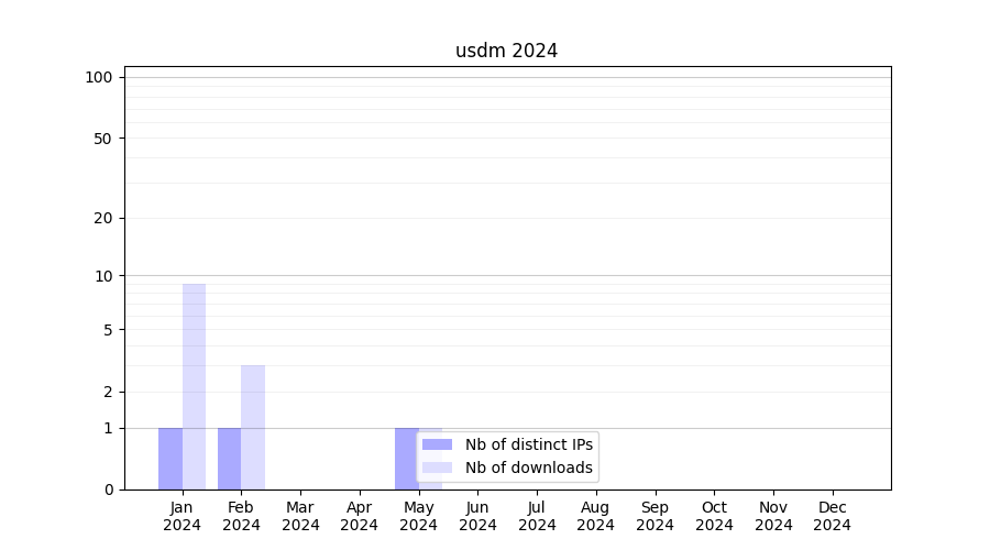Number of downloads for experiment package usdm, year by year, from 2025 back to 2014 (years with no downloads are omitted):